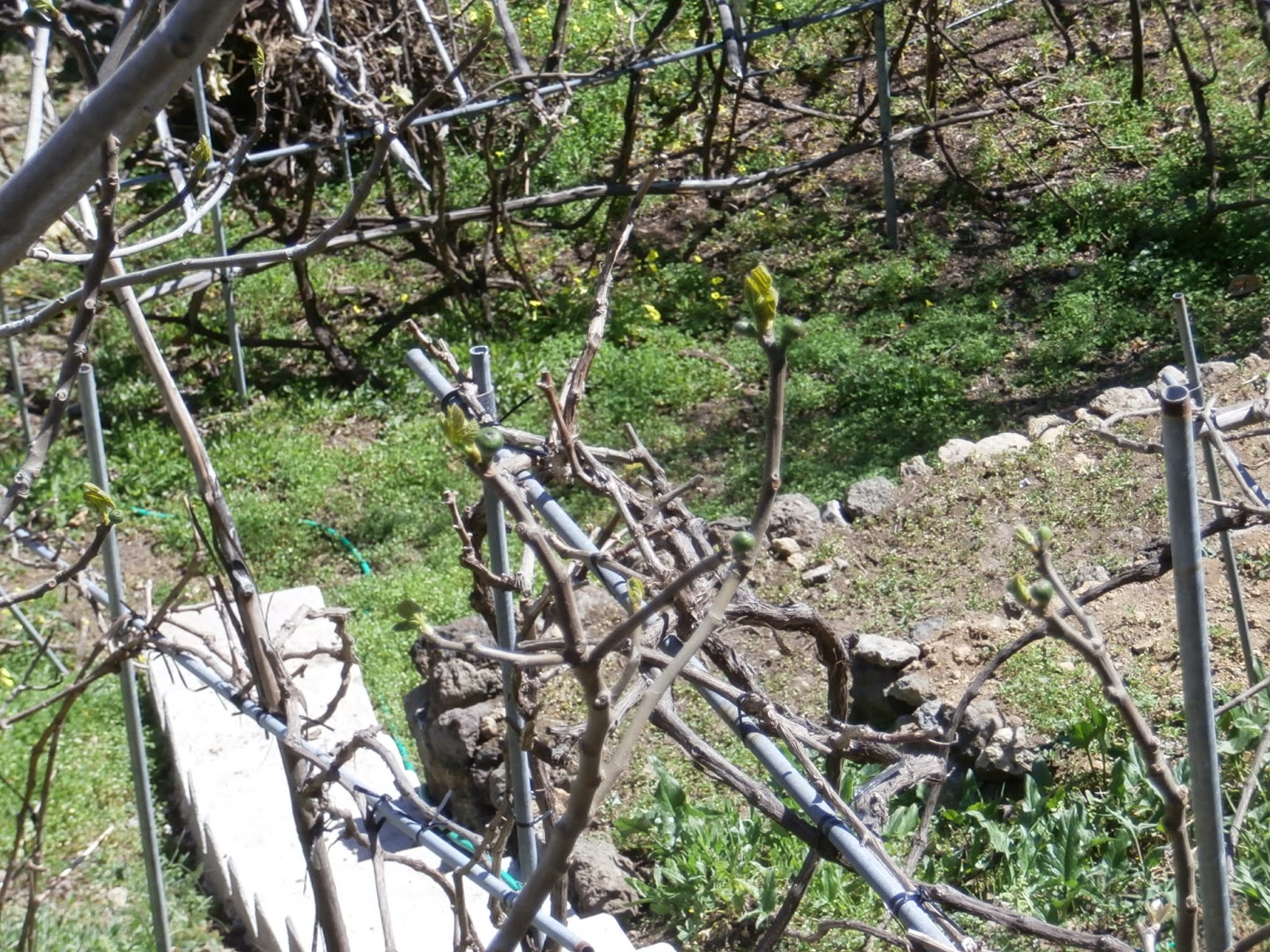 Alcune viti (una percentuale infima, per ora) hanno messo le foglioline e in una perfino si può apprezzare l'accenno di un grappolino di fiori (l'ho evidenziato perché non tutti lo riconoscerebbero)